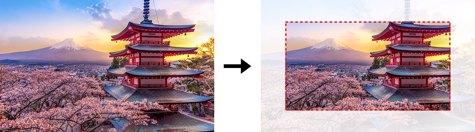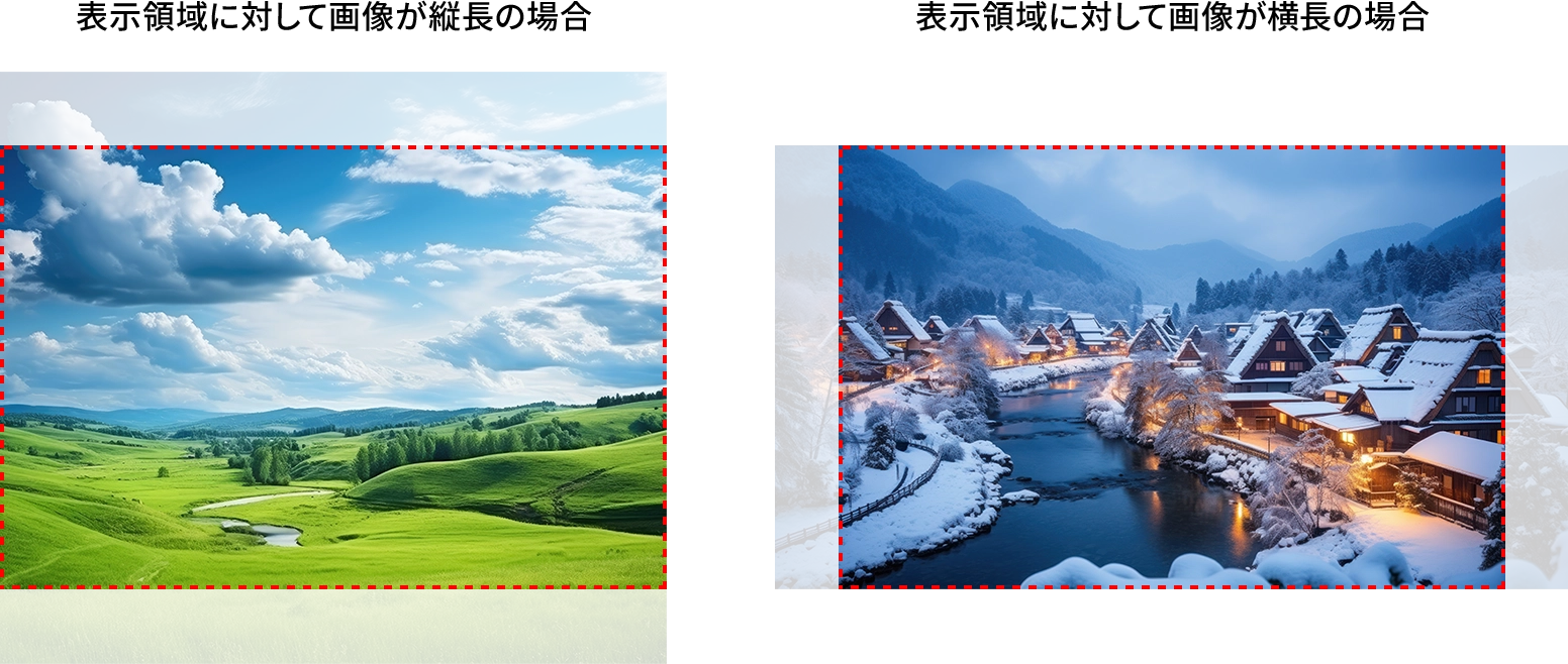 画像は縦横比を維持したまま、表示領域を完全に覆うように拡大縮小されます。表示領域に余白が発生しないように画像が引き伸ばされるので、表示領域と画像の縦横比が異なる場合は、画像の上下もしくは左右の一部が切り取られます。