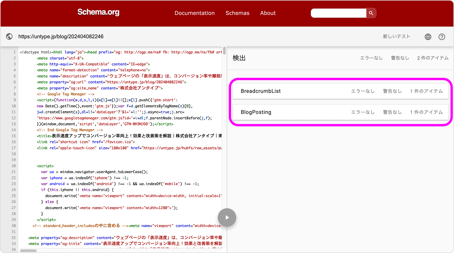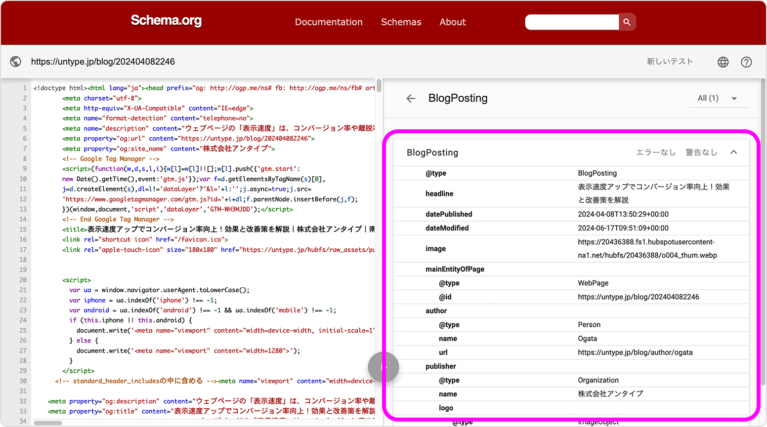 先ほどのリッチリザルトテストツールは、構造化データがリッチリザルトとして表示されるかどうかを検証します。一方、スキーママークアップ検証ツールは、リッチリザルト対象でない構造化データも含め、すべての構造化データがSchema.orgの仕様に従って正しくマークアップされているかを検証しますが、Googleが特定のリッチリザルト要件に合致しているかどうかの検証は行いません。