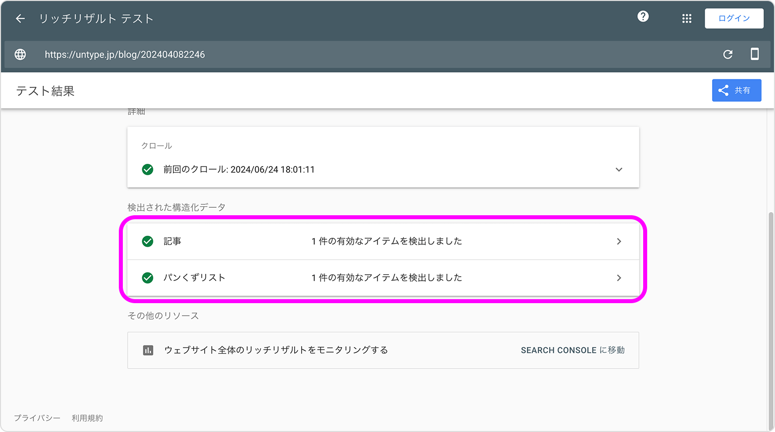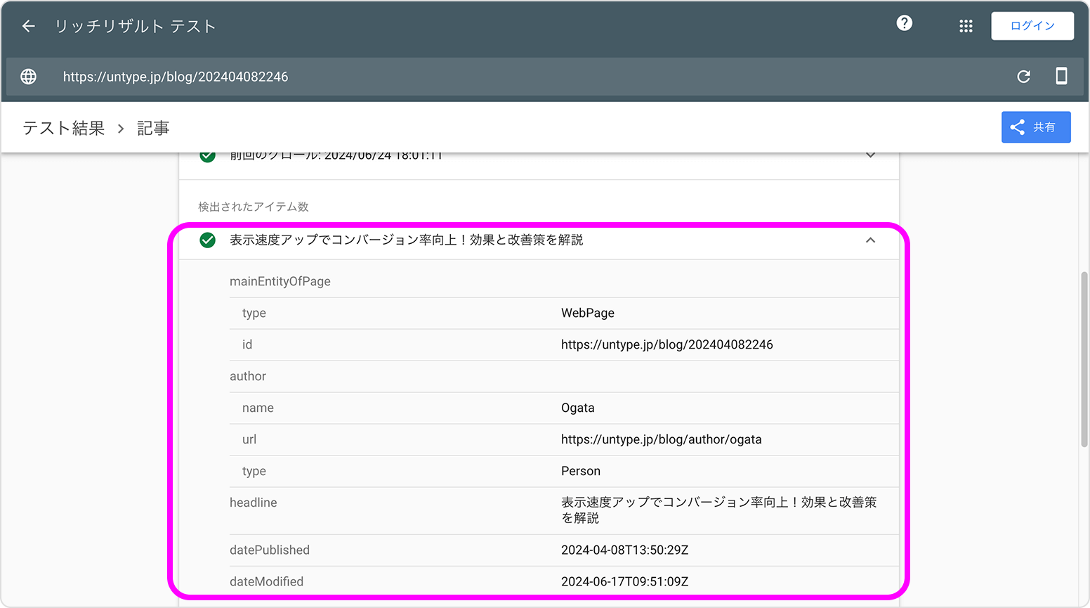 手順2)テストが実行されると、ページ内で検出された構造化データが一覧表示されます。詳細を確認したい構造化データをクリックします。