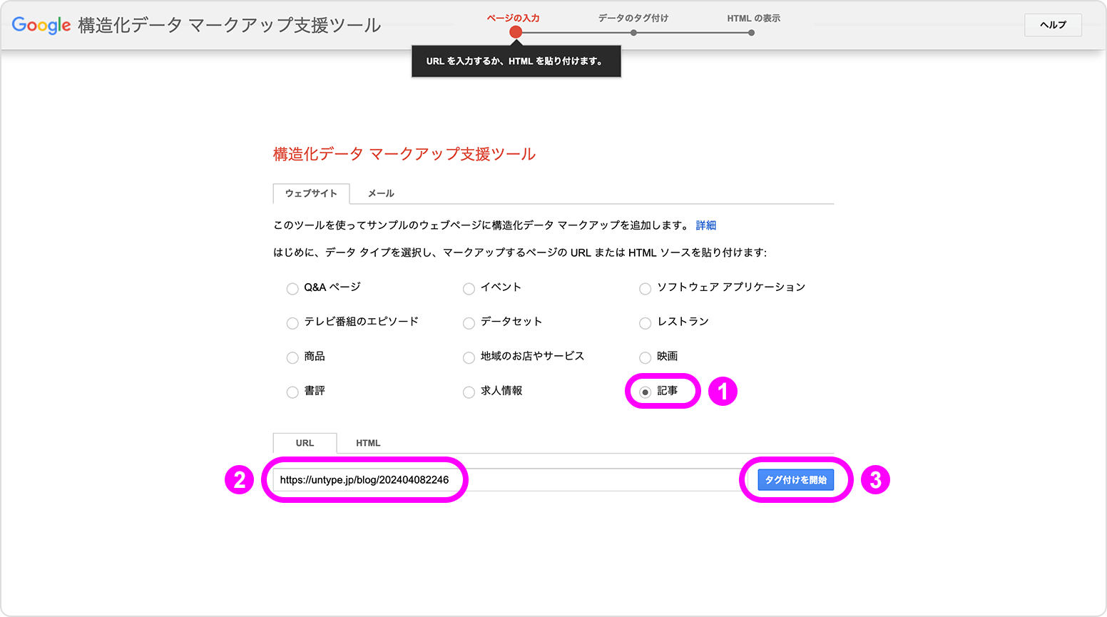 手順1)データタイプを選択し、マークアップしたいページのURLを入力します。ローカルファイルや未公開のページをマークアップする場合は、HTMLソースを直接貼り付けてください。その後、「タグ付けを開始」ボタンを押します。